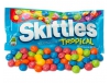 TROPINIŲ VAISIŲ SKONIO KRAMTOMIEJI SALDAINIAI Tropical Skittles, 61,5g Sudedamosios dalys: cukrus, kukurūzų sirupas, hidrintas palmių branduolių aliejus, sūdėtyje mažiau kaip 2%: citrinos rūgštis, tapijokos dekstrinas, modifikuotas kukurūzų krakmolas, natūralūs ir dirbtiniai skoniai, dažikliai (mėlyna 1 lake, titano dioksidas, raudona 40, mėlyna 1, geltona 6 lake, geltona 5, geltona 6 lake, geltona 6, raudona 40 lake), natrio citratas, karnaubo vaškas.Maistinė vertė pakuotėje: energinė vertė 250kcal, riebalų 2,5g, iš kurių riebalų rūgščių 2,5g, anglavandenių 56g, iš kurių cukraus 45g, baltymų 0g, natrio 20mg.