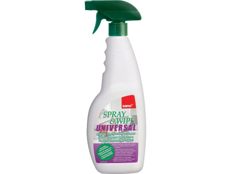 UNIVERSALUS valiklis, Sano Spray & Wipe, 750 ml Šis universalus valiklis valo nešvarumus ir pašalina riebalus nuo bet kurių paviršių - iš karto be plovimo!Turi dezinfekuojančių savybių. Skirta greitam: - Dujinių viryklių ir krosnelių;- Virtuvinių spintelių;- Kriauklių ir kranų;- Stalų;- Durų ir sienų su plastikine danga;- Baldų ir plastiko plokščių, plastikinių žaliuzių t. t. valymui. Naudojimas: priemonę užpurkšti ir patrinti – ir to pakanka. Prieš naudojimą patikrinti mažiau matomoje vietoje. Užpurkšti ir iškart patrinti šluoste ar popieriumi, nebūtina praplauti, po naudojimo uždaryti saugiklį.