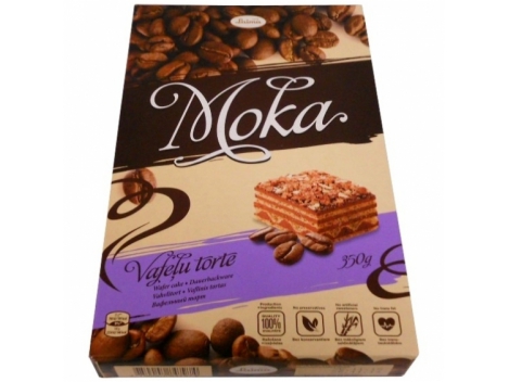 VAFLINIS TORTAS MOKA Laima, 350g Sudedamosios dalys: kvietiniai miltai, augaliniai riebalai (palmių, palmių branduolių, taukmedžio branduolių aliejai), cukrus, neriebios kakavos milteiai, sausas neriebus pienas, kiaušinių masė, kakava 2%, sviestas, emulsiklis sojų lecitinas, druska, puriklis natrio bikarbonatas, prieskoniai muskato riešutas. Sudėtyje gali būti: riešutų, žemės riešutų pėdsakų.Maistinė vertė 100g: energinė vertė 2254kJ/540kcal, riebalų 33,5g, iš kurių riebalų rūgščių 20,6g, anglavandenių 53,6g, iš kurių cukraus 30,6g, baltymų 6,1g, natrio 0,4g.